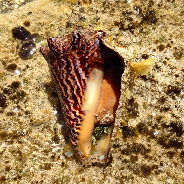 ランビ貝 (コンク貝) 。セント・マーチン島の海岸にいました!ちなみに下の方に2本ニョキッと伸びているのが目。…